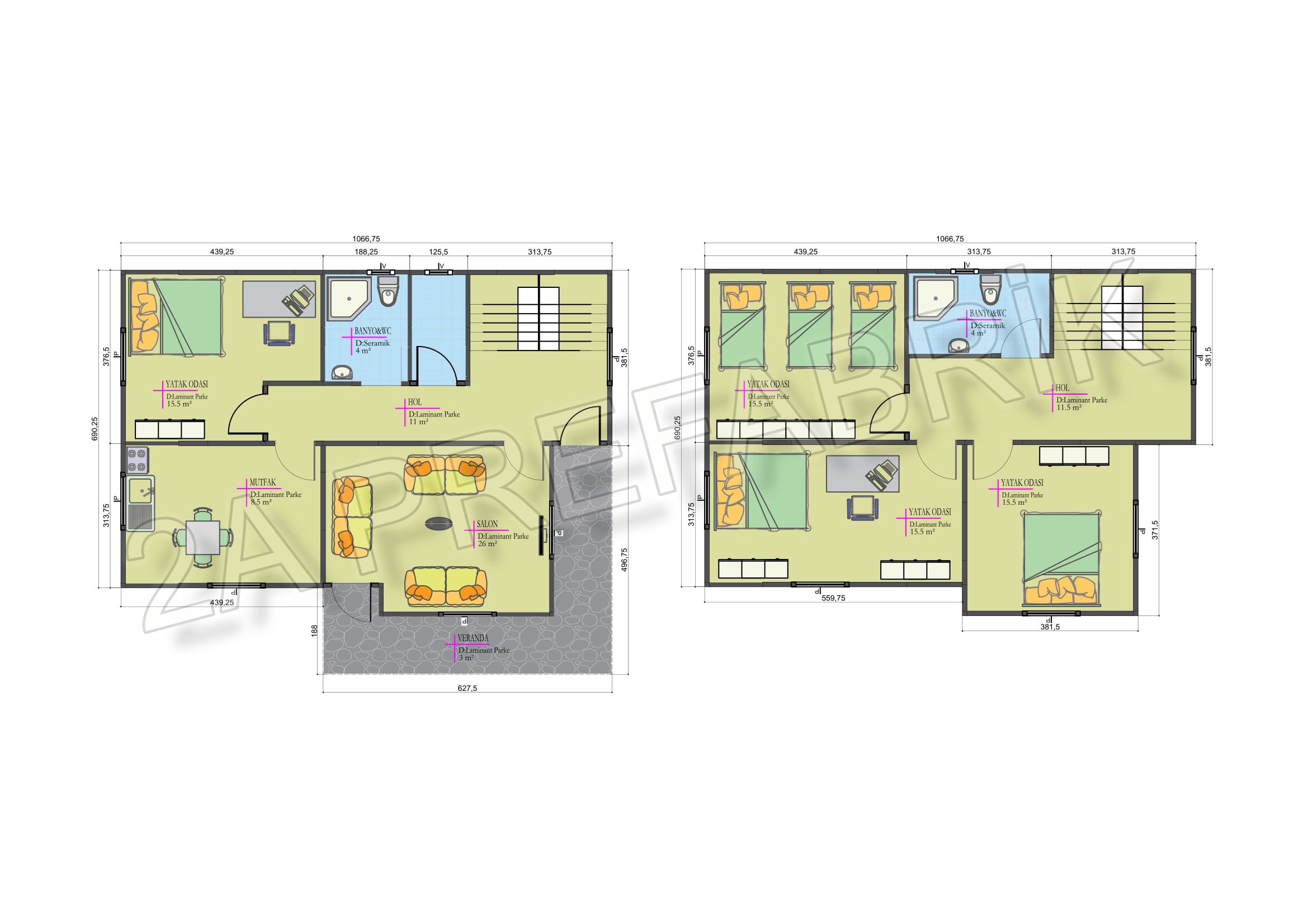158 metrekare iki katlı prefabrik ev özellikle minimalist yaşam anlayışına sahip olanlar için ideal evlerdir. 3+1 oda sayısına sahip olan prefabrik ev, 250 cm tavan yüksekliğine sahiptir, pencereler PVC ile kaplıdır.Özellikle kentin biraz uzağında kalarak yaşamını sürdürmek isteyenler için ideal olan bu tek katlı prefabrik ev, güvenli ve rahat taşınabilirliği sayesinde istediğiniz konuma yerleştirilebilir.