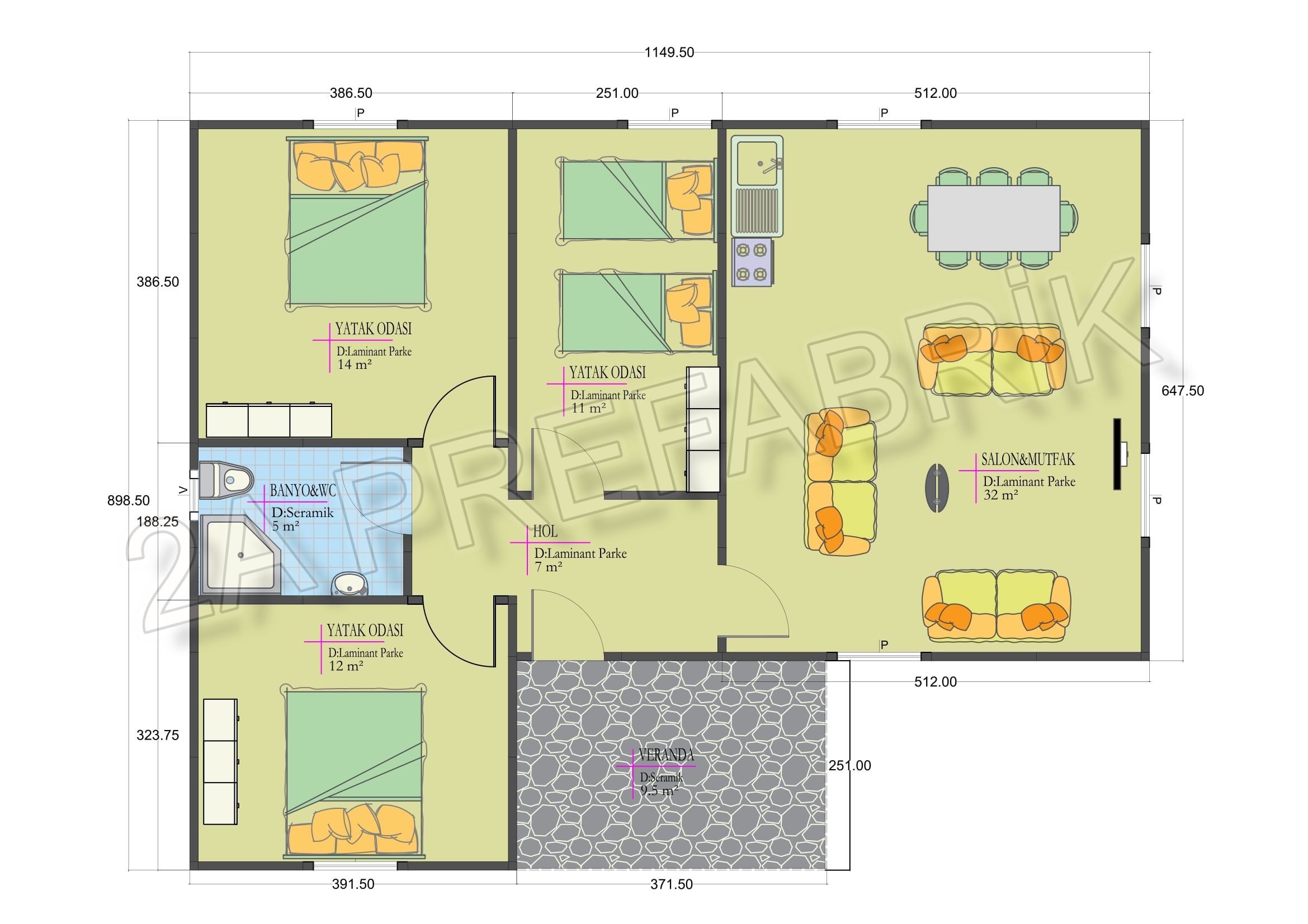 93 metrekare prefabrik ev özellikle minimalist yaşam anlayışına sahip olanlar için ideal evlerdir. 3+1 oda sayısına sahip olan prefabrik ev, 250 cm tavan yüksekliğine sahiptir, pencereler PVC ile kaplıdır.Özellikle kentin biraz uzağında kalarak yaşamını sürdürmek isteyenler için ideal olan bu tek katlı prefabrik ev, güvenli ve rahat taşınabilirliği sayesinde istediğiniz konuma yerleştirilebilir.